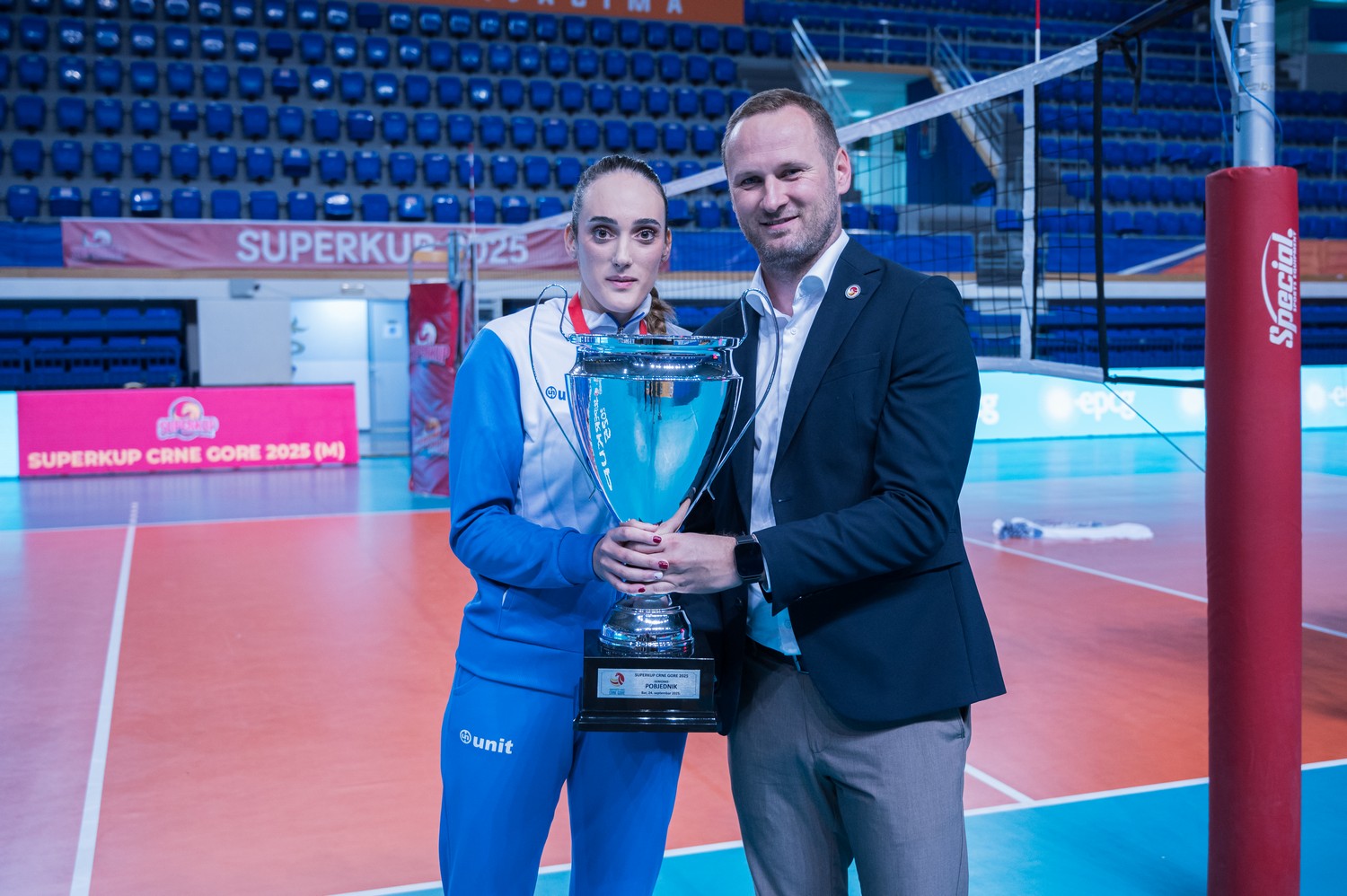 Trofej namijenjen osvajaču Superkupa uručio je predsjednik Odbojkaškog saveza Crne Gore, Nikola Kažić.